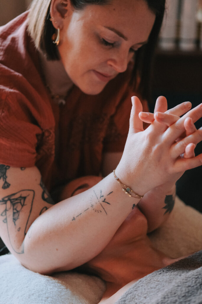 Il commence par un modelage d’accueil avec la « simplessence anti âge » sur le décolleté, les épaules et les trapèzes en invitant la personne à respirer profondément.
